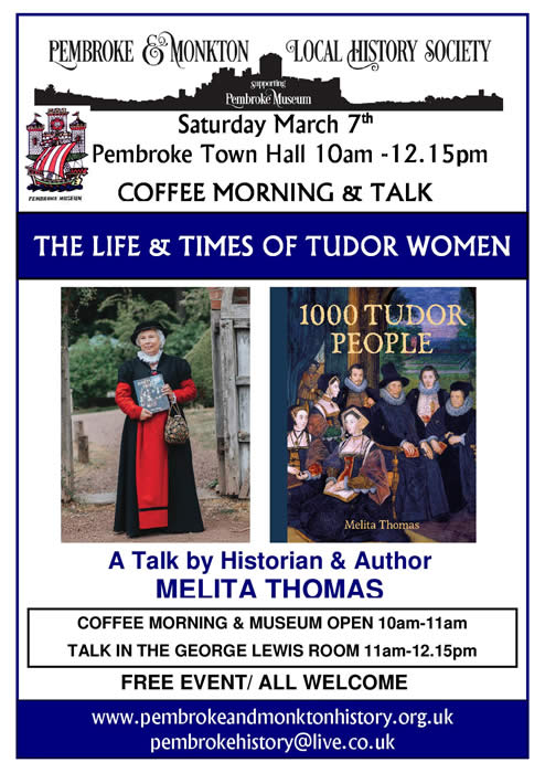 In March we welcome Historian and Author, Melita Thomas whose talk is about 'The Life and Times of Tudor Women'. In it Melita delves into her acclaimed book, 1000 Tudor People, to reveal fascinating insights into the lives of Tudor women. What were the social, legal, political, and economic problems that they had to deal with? Were their lives really as constrained as we are led to believe? Join Melita to discover more about the joys and perils of sixteenth century life. And how intrepid women could forge their own path, in trade, in literature, and even in warfare.